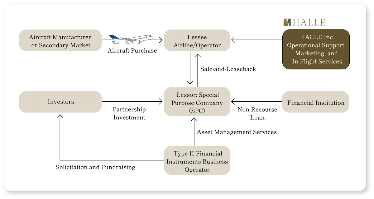HALLE Corporation specializes in private jet-related services, offering comprehensive solutions for aircraft acquisition, sales, leasing, and support operations. In particular, we excel in aircraft acquisition by providing end-to-end support, including aircraft selection, scheme creation, and the structuring of aircraft financing. The attached diagram illustrates a JOLCO* scheme utilized for aircraft financing and operational management.In addition, we provide extensive support for aircraft charter services, including operational assistance, marketing support, and event organization to meet diverse customer needs. For aircraft operations, maintenance, and management, we collaborate with specialized companies through strategic alliances. We also oversee contract performance and offer accounting support to ensure smooth private jet operations.Furthermore, HALLE Corporation enhances the luxury travel experience by dispatching specially trained cabin attendants (CAs) and delivering high-quality in-flight services tailored to individual customer preferences. Our goal is to create a comfortable and exclusive journey for every client.*JOLCO (Japanese Operating Lease with Call Option) is a financing structure leveraging Japan's tax system. Under this scheme, Japanese investors purchase an aircraft and lease it to an operator. At the end of the lease term, the operator has the option to purchase the aircraft at a predetermined price. This structure is widely recognized as an efficient method of financing aircraft acquisitions.