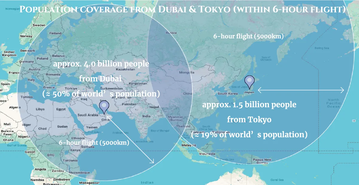 Dubai's strategic location links Europe, Asia and Africa, with almost half the world's population within a 6-hour flight (approximately 5,000km). Dubai International Airport (DXB) is one of the world's busiest, serving as a hub for multinational corporations and reinforcing Dubai's status as a leading international business centre.
