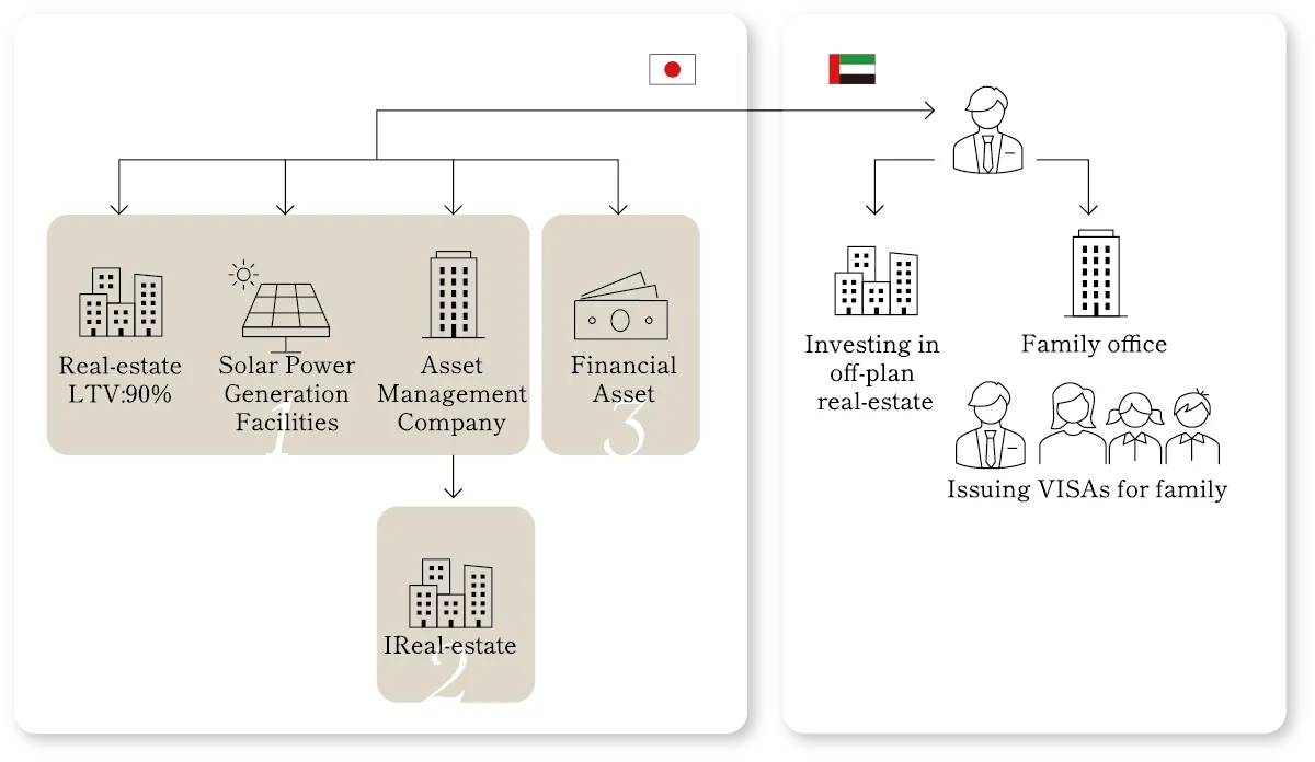 The client has built assets in Japan, including real estate, solar power facilities, and financial assets, and has decided to relocate to Dubai. In Dubai, they have purchased several properties and established a family office to issue visas for their family. Moving forward, they aim to enhance personal creditworthiness and actively engage in real estate investment by utilizing bank loans. They are also seeking advice on asset management in Japan and the development of an appropriate tax scheme.